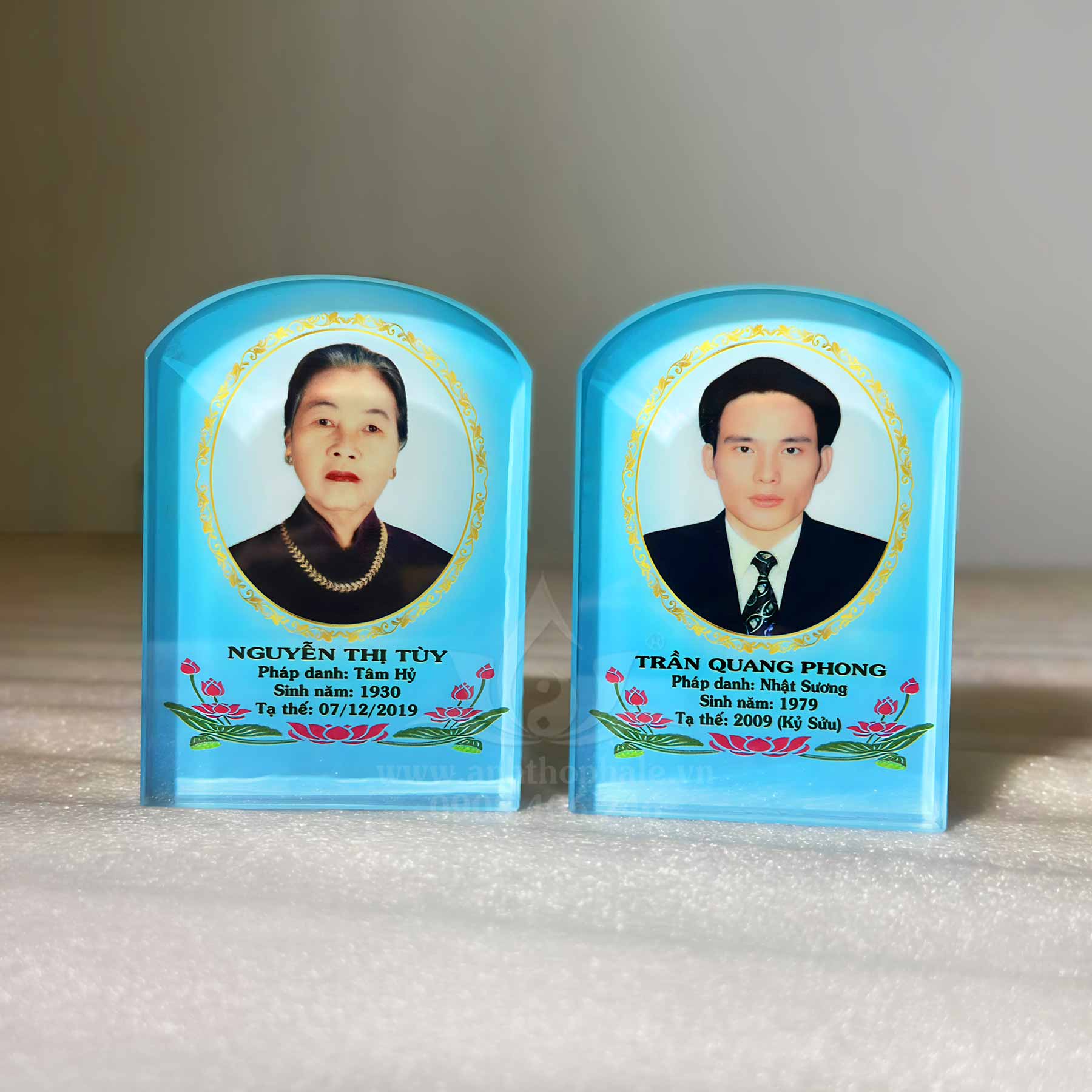 Bài vị pha lê in màu trong chùa 7x10cm xanh