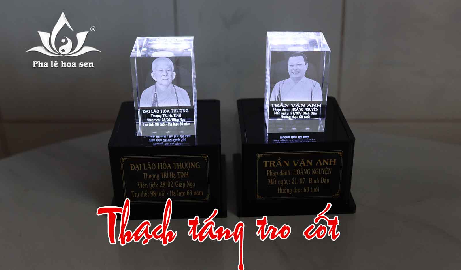 Hình ảnh người quá cố được khắc chìm vào khối pha lê cùng với hệ thống đèn chiếu sáng tạo nên vẻ đẹp lung linh huyền diệu vững bền theo thời gian.