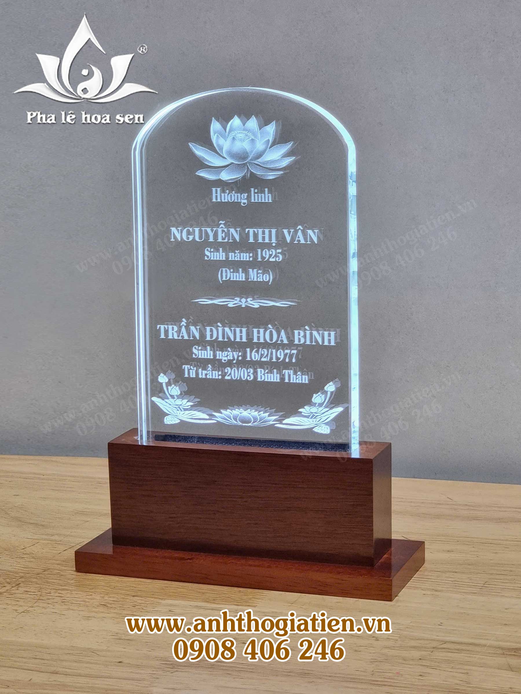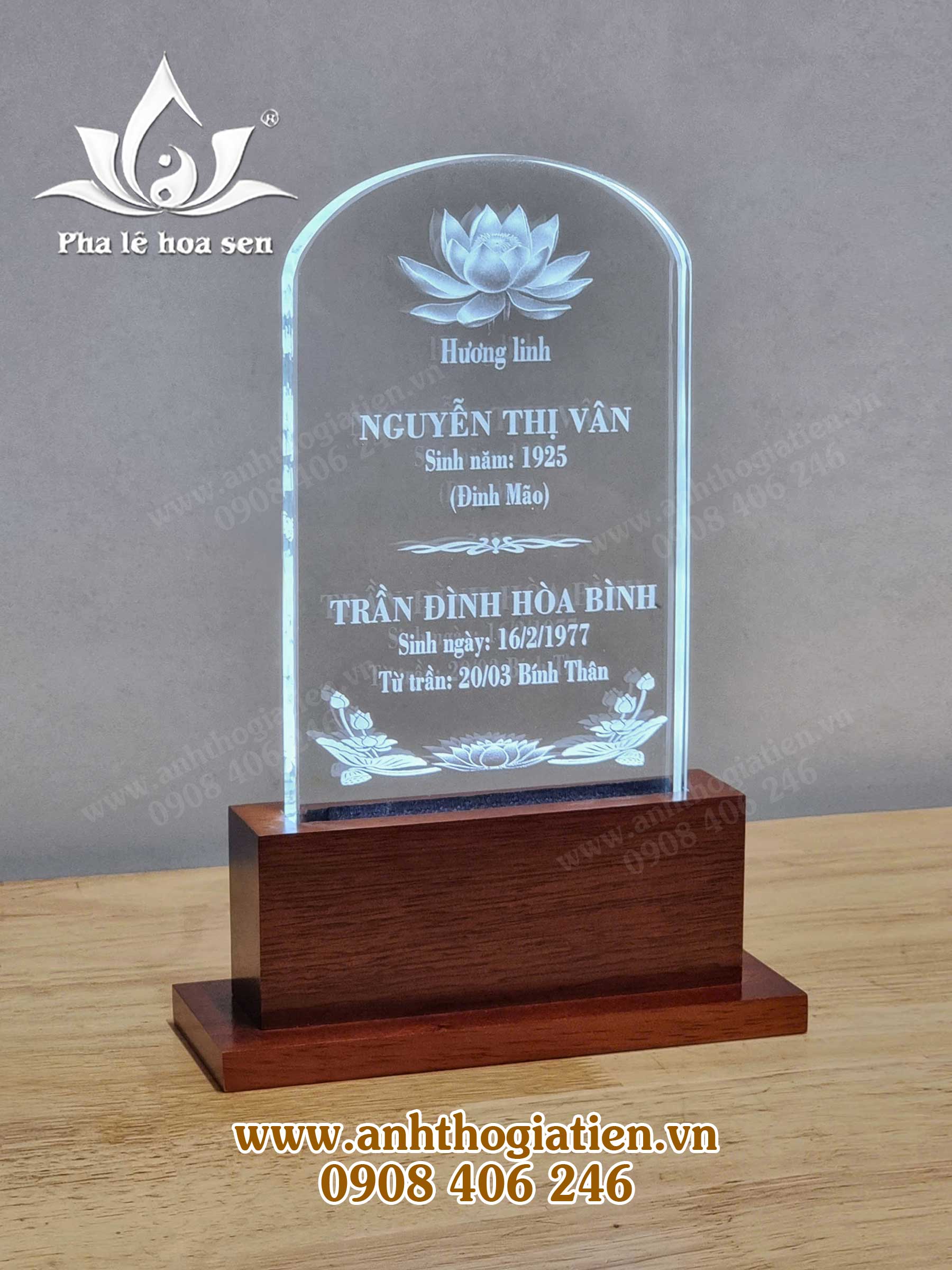 - Bài vị khắc laser pha lê hoa sen 12x20cm.