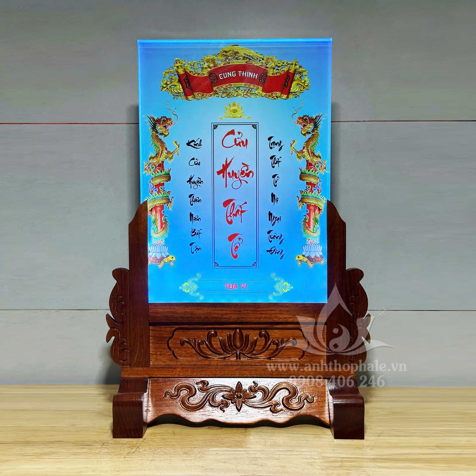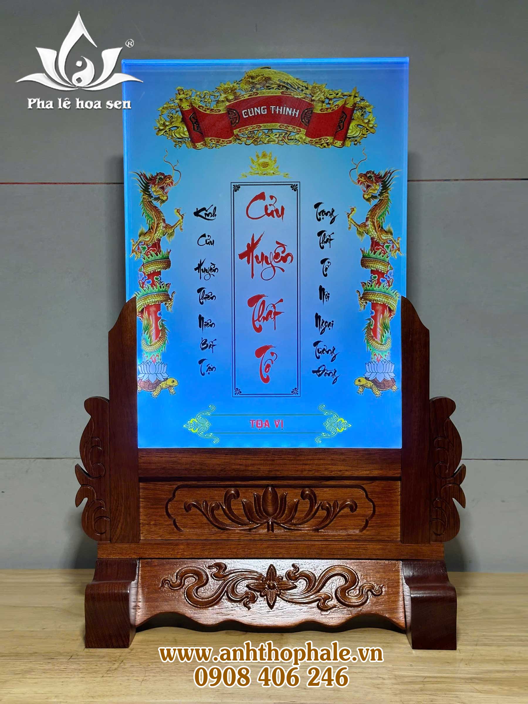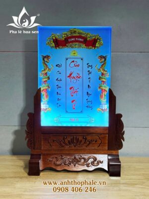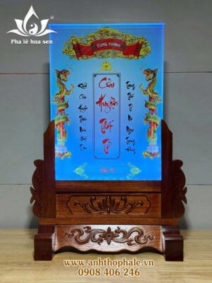 – Cửu huyền thất tổ pha lê 25×35 in màu đế gỗ khắc CNC hoa văn